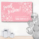 Sweet Sixteen Pink White Birthday Banner: Celebrate a special milestone with this elegant 16th birthday banner. Featuring a sophisticated pink background adorned with white flowers, this banner combines classic serif fonts and script typography to create a stylish look. The text prominently displays "Sweet Sixteen" and can be personalised to include the birthday honoree's name, making it perfect for celebrating sixteen wonderful years. This beautiful botanical design is customisable, allowing you to change the colours of the fonts and flowers to suit your theme. Ideal for a party or event, this banner adds a touch of charm and elegance to any celebration.