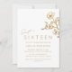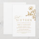 Pretty, glam-style sweet 16 invitations with subtle floral detailing. Gold on a white background. Please note: Gold effect is replicated by a high quality graphic. No real foil will be used.