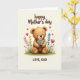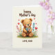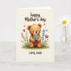 This card shows a cuddly, human-like plush animal with russet-brown fur sitting near the lower middle of the design, wearing a shy closed-mouth smile and soft pink cheeks that make it look lovingly bashful. Its bright eyes seem to gaze forward with gentle affection, as if offering a quiet moment of friendship or romance ❤️. Tucked in its arms is a small bouquet of wildflowers in sky blue, pale pink, and sunny yellow, held close like a thoughtful gift. Around the figure, slim plant sprigs rise on both sides with leaves in magenta, golden yellow, and teal, growing from a softly wavy patch of green grass. A few tiny red hearts drift in the air near its head and shoulders, adding a tender, affectionate touch 🌼. The background stays a calm cream tone, keeping the pastel colors soft and easy to notice. A flowing message in dark lettering sits at the top, and a shorter dedication in matching dark text is placed along the bottom margin.