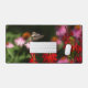 A hummingbird approaches a cardinal flower in a vibrant garden. The dark green background serves to highlight the bird and flower blossoms.