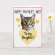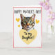 This card features a realistic tabby cat’s head centred on a bright white background, looking straight out with emerald green eyes that feel like a quiet, affectionate hello ❤️. Earthy brown, black, and warm tan stripes are detailed through the fur, with fine white whiskers fanning from a soft pink nose. A few small yellow hearts float around the cat’s face, adding a gentle, caring mood like a close bond shared without many words 🌼. Near the top, the text “HAPPY MOTHER’S DAY!” sits above the cat in yellow, set in a casual handwritten-style font. Below the cat, a large yellow heart holds the message “To my Daughter!” in the same yellow lettering, centred neatly inside the heart. The simple layout keeps attention on the cat’s tender gaze while the hearts and words add a sweet, friendly warmth to the scene. A thin pink border made of short dashed marks frames the entire design.