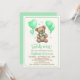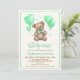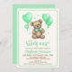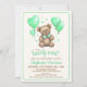 A fun play on words with these we can "bearly wait!" teddy bear baby shower invitations. Featuring a sweet little teddy bear with a pale green bow, green heart shaped balloons and green hearts.