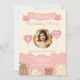 This adorable first birthday invitation features a soft pink and beige colour scheme with cute teddy bear illustrations along the bottom. A customisable photo section allows you to personalise the invite with the birthday child's picture. Elegant script and playful fonts highlight the event details, making it a perfect choice for a sweet and charming celebration. Customise for a personal touch!