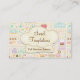 Fun whimsical bakery business card or event catering business full of delightful sweets, cakes, cupcakes and more in pastel aqua, pink, mauve and ivory with Chef hat banner ready to display your business name. Business Card back is fully customisable by you.