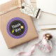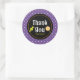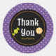 Cute Happy Halloween Thank You round sticker featuring a purple and white polka dot pattern background and Halloween themed wrapped candy and lollipop. Use it to seal your Halloween Invitation envelopes, favour bags or for decoration. Check out the matching Halloween Party invitation and other party goods in my store here -> http://www.zazzle.com/collections/sweet_trick_or_treat_halloween_party-119923007131813620?rf=238364477188679314