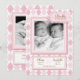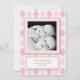 A sweet pink and white argyle diamond patterned background is accented with a faux gift tag and frames two photos of your dear little baby girls on both the front and the back. Space for all the birth info and family info on this two-sided announcement makes it a great choice for letting family and friends know your wonderful news.