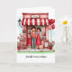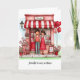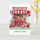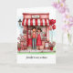 Personalize your Valentine for him or her on this sweet folded greeting card printed with an adorable couple and their quirky little shop scene filled with lots of tiny hearts, balloons and flowers details. Edit your names, monograms and other text front and inside. Watercolor style illustration has an abstract pastel background front and back. Created in a palette of mostly red and pink colors, with your choice of sizes.
