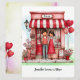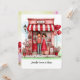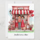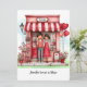 Personalize your Valentine for him or her on this sweet flat greeting card printed with an adorable couple and their quirky little shop scene filled with lots of tiny hearts, balloons and flowers details. Edit your names, monograms and other text front and back. Watercolor style illustration has an abstract pastel background front and back. Created in a palette of mostly red and pink colors, with your choice of sizes.