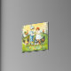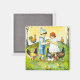 A vintage Easter magnet with an illustration made of Swedish painter Jenny Nyström. The illustration show a little boy and a girl with roosters, chickens and hens on a spring meadow. The illustration is in the public domain.