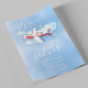 Cute aeroplane baby shower invitation with a invitation template that is easy to personalise. Featuring a blue sky background, a red, white and blue aeroplane, clouds, stars and text that reads 'fly on over' in a script font. All font styles, sizes and background colour can be changed by clicking on the customise further link after personalising.