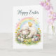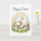 A cozy watercolor sheep resting on green grass under a soft rainbow. Featuring a cute chick and vibrant spring flowers for a joyful greeting.