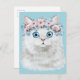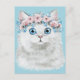This design features a pretty white kitten wearing a pink and blue flower halo.
