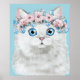 This design features a pretty white kitten wearing a pink and blue flower halo.
