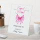Sweetheart pink bow with hearts Valentine's baby girls shower Welcome pedestal sign. An elegant pink coquette bow, decorated with hot pink hearts, adds a touch of Valentines whimsy to this "WELCOME" sign. It also includes the text "A little Sweetheart is on the way," using hearets to replace two letters and set a joyful mood.