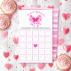 Sweetheart pink coquette bow baby girl shower Bingo game card. The design showcases a pink coquette bow adorned with vibrant magenta hearts, adding a touch of whimsy and love spirit. It also features a shamrock in one square. The back features a playful watercolor striped pattern of varying pink and white stripes and hearts, completing the card's cohesive and elegant look.
