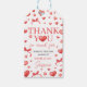 A sweetheart-themed thank you favor tag featuring red watercolor hearts, bows, and elegant modern lettering. Perfect for attaching to party favors and expressing gratitude for celebrating the special day. Ideal for heart-themed, girly, or sweet first birthday parties and coordinated décor.