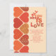 A festive invitation with two rows of multi-print hearts in front over a tan background. Rows of the same pattern repeated in the back. The words "All you need is love" are block-cut from the same pattern. Perfect for any Valentine celebration. (FP)