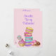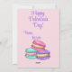 This sweet card features a stack of macarons, a cupcake and lollipop and some frosted doughnuts on top of a pink with white polka dot background. It says "Sweetie, Be my Valentine!' On the reverse side it has a small stack of macarons and it says "Happy Valentine's Day" and you personalise it with your name.