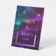 Sweets and Treats Cosmic Purple Teal Silver Sun Moon Astronomy Space Wedding Event Pedestal Sign features silver sun, moon and stars with a silver frame on a colourful mystical purple, teal and blue cosmic background. Inside is your custom text. Designed for you by © Evco Studio www.zazzle.com/store/evcostudio