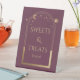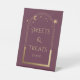 Sweets and Treats Mystical Plum Gold Sun Moon Stars Astronomy Celestial Cosmic Galaxy Space Wedding Event Pedestal Sign features a gold sun, moon and stars frame on a plum background. Inside is your custom text. Designed for you by ©2022 Evco Studio www.zazzle.com/store/evcostudio