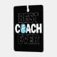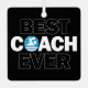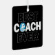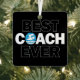 A unique metal Christmas ornament for the world's best swim coaches, with BEST COACH EVER in bold black and white text and a swimmer icon in place of the O. Makes an excellent Christmas gift for swimming and diving coaches.
