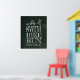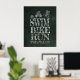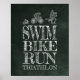 Graphical wall art poster inspired by chalkboard motivational drawings. Noteable triathlon event icons above hand-drawn looking words “SWIM BIKE RUN”. White chalk over a black chalkboard representation.