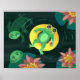 Three green frogs go for a relaxing swim in the rich emerald waters of a summer pound. The bright yellow inner tube and a frog's red fruit punch beverage, bring a splash of colour to the delightful scene. Original illustration by Noël Snow