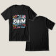 A black T-shirt featuring a vibrant design with the word "SWIM" in bold white letters, surrounded by colourful swimming icons like goggles and a pool float. The phrases "IT'S IN YOUR BLOOD!" and "LIVE LOVE SWIM!" in red add an energetic touch, perfect for swimmers who live and breathe the sport.