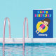 Awesome kids swimming pool party Happy Birthday card for a brunette child on the swim team during the summer. Features a bright, fun pop of colours and an adorable swimming girl in an inner tube. Customise for a special children's gift.