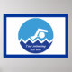 Swimming gifts, swimmer on a blue circle custom gift design featuring a minimalist white icon of a swimmer on a two tone blue circle-sea and sky and a blue border. This cool design is a template and it is completely customisable. Personalise it and change text with monogram, name or your message. The perfect gift ideas for the fanatic swimmer and the swim lover.