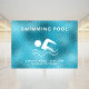 A blue faux metallic looking background, white coloured text. Personalise and add the opening hours for the swimming pool