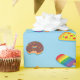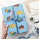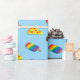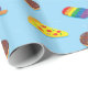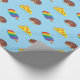 Wrapping paper with a collection of swimming pool floats arranged in a pattern. They consists of Popsicle ice cream pop in rainbow shades, a chocolate frosting doughnut with rainbow sprinkles and a slice of pizza topped with salami, mushrooms and capsicum. Great for wrapping presents for summer birthday parties.