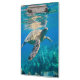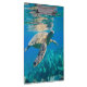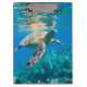 Underwater photograph of a sea turtle swimming in crystal clear water just below the surface.