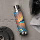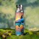 This beverage bottle features a stunning image of a blue shark swimming in the sea alongside tropical fish. The light of a blazing orange and gold sunset at the horizon shines through the water. Beautiful!
