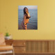 A woman in a black bikini poses gracefully by the shoreline during sunset. The gentle waves and golden hour light create a serene atmosphere.