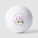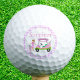 This golf ball design features a woman golfer with a pink golf bag and a golf cart decorated with a breast cancer ribbon pattern. A fun and meaningful keepsake for charity golf outings, customisable with your monogram, name, or event details.