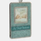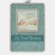 This pretty Christmas keepsake ornament features your baby photograph against a background of aqua blue floral swirl. A darker teal banner holds your customised text. This makes a wonderful ornament gift for new parents.