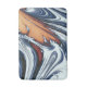 An abstract art design of swirling river water in blue, black, orange and white.