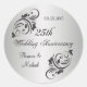 25th Wedding Anniversary Sicker decorated with black swirls and flowers on silver background. Easy to customise - just put your names and date.