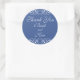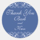 This is the coordinating Thank You Sticker for the Blue Swirls wedding line. It is the perfect size for thank you favours. It can easily be made smaller for thank you card envelope seals. Let me know if I can help with that.