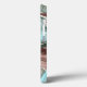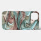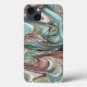 Abstract art on iPhone phone case, swirls of green, mauve, black, blue, and gold.