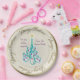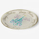 Beautiful paper plate with an original digital painting by Leslie Sigal Javorek of a swirly turquoise Christmas tree w/ violet ornaments on a Trompe L'oeil (trick of the eye) background illusion of fine bone china & greater depth. 2 custom text fields to personalise plate for a great gift.