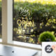 Opening hours window cling for your hair salon or hair styling business with Hair written in a white swirly calligraphy script next to a pair of gold colored scissors. Personalize with your opening hours. Add your phone number too so your clients know where to call to make an appointment.