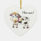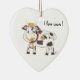 A fun ceramic heart-shaped Christmas ornament with the illustration of a white and black Swiss cow wearing a Swiss cow bell around her neck and chewing on a yellow wild flower . It also has the words "I love cows !" on the upper right hand side :) © ArianeC Illustrations