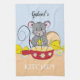 A cute kitchen towel with a grey cartoon mouse either making some fondue ...or stealing the cheese ...You decide ! Personalise it with a name and your own text .