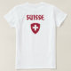 "Switzerland" type and national flag in a clean style. The word SWITZERLAND is set in a stylised typeface over an image of the Swiss Coat of Arms. The coat of arms of Switzerland shows the same white cross as the flag of Switzerland, but on a red shield. Like the Swiss flag, the coat of arms is used on many items, such as Swiss francs, Swiss car number plates, and Swiss-branded exports such as Swiss Army knives. Remember the design may not work on all shirt styles and colours. The design position may shift depending on the shirt style chosen. Click the "Customise It" button to adjust the design position to your liking.