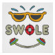 Swole bodybuilding design features some sweat above a pair of shades, the word "Swole" with the "o" as a target, and a smile made from a set of weights. A fun design for lifting and bulking fans.