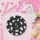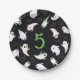 Spooktacular Halloween birthday party paper plates with swooping ghosts and bats against a black background with the birthday girl or boy's age in the middle.