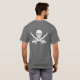 The iconic Jolly Roger pirate flag symbol with crossed swords - full size on the back and repeated on the front "pocket". In white on any dark shirt you choose!
