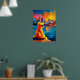 Warm Sydney teddy golden harbor artwork featuring a contemplative teddy bear silhouette overlooking the Opera House and Harbour Bridge at sunset. Bold fauvist colors and crisp segmented reflections create vibrant wall art perfect for australia lovers, nursery decor, and modern interiors.